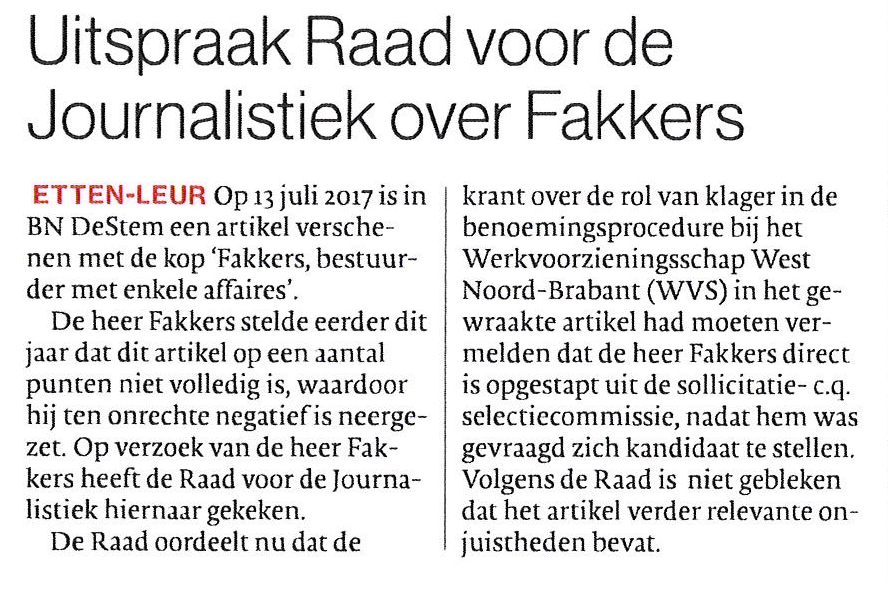 H. den Ridder, J. Lazaroms en H. van der Kaa (BN DeStem) hebben in het artikel “Fakkers, bestuurder met enkele affaires” onvolledig bericht over de rol van F. Fakkers (klager) in een benoemingsprocedure bij het Werkvoorzieningsschap West Noord-Brabant (WVS) en over zijn vertrek bij deze organisatie. Bezien in het licht van de kop boven het artikel is hierdoor de integriteit van klager onnodig aangetast en heeft BN DeStem op deze punten journalistiek onzorgvuldig gehandeld. Niet is gebleken dat het artikel verder relevante onjuistheden bevat. Voor zover klager bezwaar heeft gemaakt tegen andere passages, bestaat geen aanleiding voor de conclusie dat de krant ontoelaatbaar heeft gehandeld. De Raad voor de Journalistiek doet de aanbeveling aan BN DeStem om deze conclusie ruimhartig te publiceren.