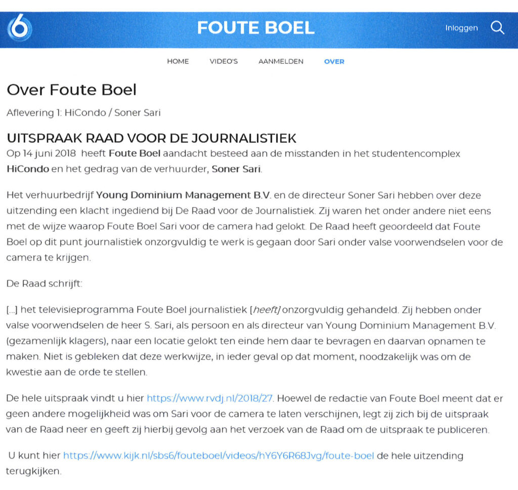Het is klagers bekend dat ‘De Bree’ daarna telefonisch contact heeft gezocht met de eigenaar van HiCondo. Vervolgens kwamen zij erachter dat SBS6 een nieuw televisieprogramma maakt (Foute Boel) waarin zij als ‘huisjesmelkers’ ten tonele zullen worden gevoerd. Aan bewoners van HiCondo is gevraagd SBS6 ten behoeve van het programma in te lichten over klachten.