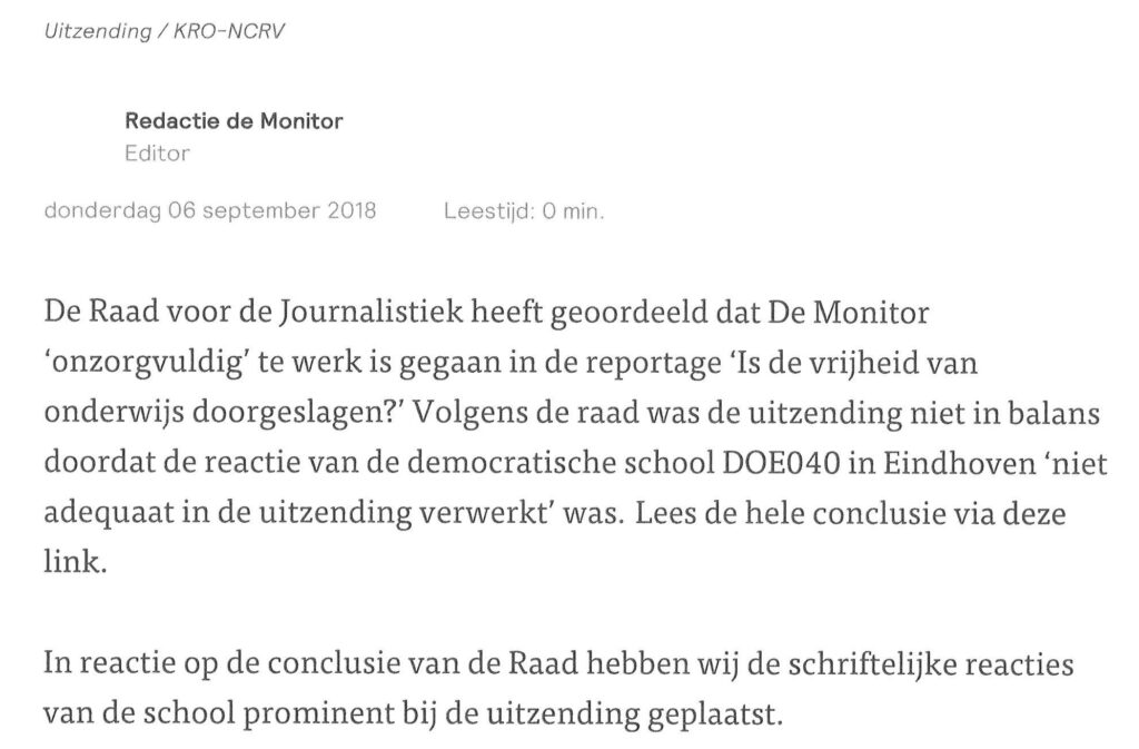 Verder is op 5 februari 2018 nog het artikel “Kwaliteit democratische scholen black box” op de website van De Monitor gepubliceerd. De intro van dit artikel luidt: