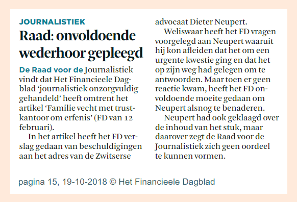V. van der Boon en J. Bonjer (Het Financieele Dagblad) hebben journalistiek onzorgvuldig gehandeld door voorafgaand aan de publicatie van het artikel “Familie vecht met trustkantoor om erfenis” onvoldoende wederhoor toe te passen bij de heer D.W. Neupert (klager). Gezien de ernst van de gepubliceerde beschuldigingen – die voor een belangrijk deel klager persoonlijk betreffen – hadden zij meer pogingen moeten ondernemen om klager te bereiken.