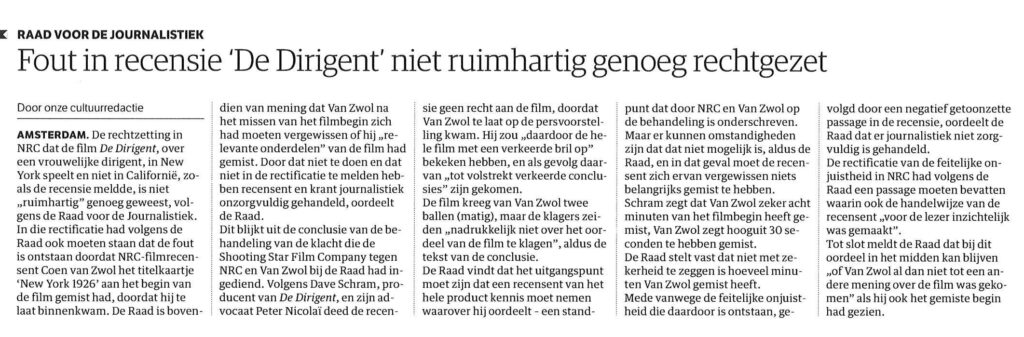 C. van Zwol en NRC Handelsblad hebben op journalistiek onzorgvuldige wijze aandacht besteed aan de door Shooting Star Filmcompany (klaagster) geproduceerde film ‘De Dirigent’. Een recensent is vrij om zijn mening te geven over gebeurtenissen en personen, en die mening mag ‘shock, disturb and offend’. Als uitgangspunt dient dat een recensent kennisneemt van het hele product dat hij beoordeelt. Niettemin kunnen zich bijzondere omstandigheden voordoen, waardoor dat niet mogelijk is. In dat geval doet hij er goed aan om zich ten minste ervan te vergewissen of hij een relevant onderdeel heeft gemist. Van Zwol heeft dat niet gedaan. Verder geldt dat recensies geen wezenlijke onjuistheden mogen bevatten. Als de recensent een aantoonbare fout maakt dan loopt hij het risico dat zijn handelen als onzorgvuldig kan worden aangeduid. Dit geldt te meer als de onjuiste of onvolledige opmerking betrekking heeft op het deel van het product waarvan hij niet heeft kennis genomen. Van Zwol en NRC hebben een recensie gepubliceerd die in ieder geval één feitelijke onjuistheid bevatte als gevolg van het feit dat Van Zwol het begin van de film had gemist. Deze omissie is versterkt doordat juist de foute opmerking de opmaat geeft van een verder negatieve toonzetting. Hierna had het op de weg van Van Zwol en NRC gelegen om over te gaan tot een ruimhartige rectificatie, waarin de handelwijze van Van Zwol voor de lezer inzichtelijk was gemaakt. Dat is echter niet gebeurd. De Raad voor de Journalistiek doet de aanbeveling aan NRC Handelsblad om deze conclusie ruimhartig te publiceren.