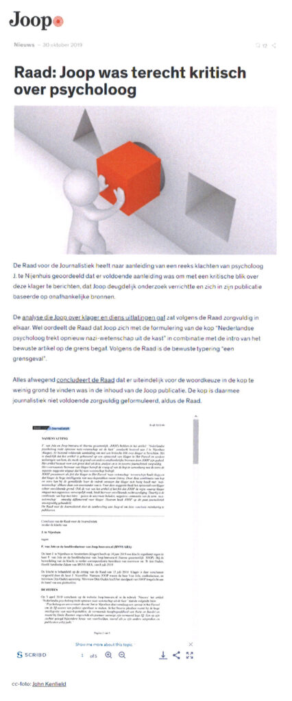 Op 3 april 2019 verscheen op de website Joop.bnnvara.nl in de rubriek ‘Nieuws’ het artikel “Nederlandse psycholoog trekt opnieuw nazi-wetenschap uit de kast” met de volgende intro: