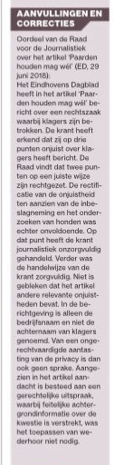 De Raad vindt echter dat de rechtzetting van punt 3. in het artikel van 1 augustus 2018 onvoldoende is geweest. Door in het gewraakte artikel te schrijven “In april 2016 deden instanties als het Openbaar Ministerie, de gemeente, Dierenbescherming en de Belastingdienst gezamenlijk een inval bij de twee handelaren. Honden werden in beslag genomen en onderzocht.” is tenminste de suggestie gewekt dat er ook honden in beslag zijn genomen en onderzocht bij de hondenhandel van klagers c.q. mevrouw Y. Gelet op de verdere inhoud van het artikel in kwestie was dit een suggestie die het bedrijf in grote mate diskwalificeert. Toen klagers te kennen hadden gegeven dat de berichtgeving op dit punt voor wat betreft de Cartierhoeve feitelijk onjuist was, had de krant dit op eenvoudige wijze ruimhartig behoren te rectificeren. Dat heeft de krant nagelaten. Door te vermelden dat de in beslagneming ‘niet is vast komen staan’ en dat de eigenaar van de hondenhandel ‘ontkent dat er honden in beslag zijn genomen’ is ook het rectificatiebericht voor meerdere interpretaties vatbaar. De mogelijkheid wordt immers open gehouden dat er wel degelijk honden in beslag zijn genomen en onderzocht. Hierdoor is van een passende en faire rectificatie geen sprake.