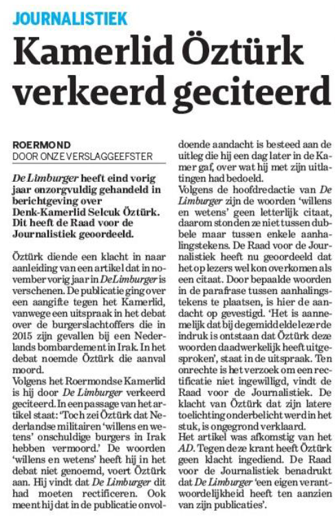Het betoog van klagers dat de toelichting van Öztürk onvoldoende recht is gedaan, volgt de Raad niet. Kern van die toelichting is dat Öztürk ‘verkeerd begrepen’ is, hetgeen in het artikel is weergegeven. Blijkens het verslag van het debat over de defensiebegroting heeft hij deze woorden ook letterlijk gebezigd. Dat hij aandacht heeft gevraagd voor de gevoelens van nabestaanden, maakt dit niet anders; een volksvertegenwoordiger wordt immers geacht altijd de belangen van anderen te behartigen. Op dit punt was de handelwijze van De Limburger zorgvuldig.