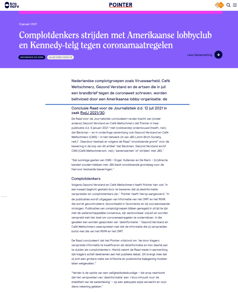Beckman, Café Weltschmerz (CWS) en Artsen Covid Collectief – betreft (met name) het artikel van 20 december 2020 van De Groene Amsterdammer en de publicaties van Pointer