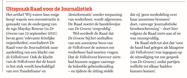 De Groene Amsterdammer heeft in de publicatie “’Wij waren hun enige hoop’” een reconstructie gemaakt van de ondergang van ngo Mayday Rescue en in dat verband ook aandacht besteed aan berichtgeving van de Volkskrant (klaagster) over de ngo. Er is geen sprake van beschuldigingen aan het adres van klaagster met betrekking tot het bijdragen aan een fraudeframe of van het actief meewerken aan een desinformatiecampagne. Op deze punten behoefde daarom geen wederhoor te worden toegepast. Verder is niet gebleken van relevante feitelijke onjuistheden. In zoverre heeft De Groene Amsterdammer journalistiek zorgvuldig gehandeld. Dit is anders ten aanzien van het onthullen van een (volgens De Groene Amsterdammer) anonieme bron van de Volkskrant, terwijl deze in de publicatie wordt neergezet als onbetrouwbaar. Die onthulling, waarvan niet duidelijk is waarom die journalistiek relevant was, kan niet anders worden begrepen dan als een diskwalificatie van het gebruik van die bron en daarmee van het werk van de Volkskrant. Op dit punt heeft De Groene Amsterdammer ten onrechte nagelaten wederhoor toe te passen, waardoor zij journalistiek onzorgvuldig heeft gehandeld. De Raad voor de Journalistiek doet de aanbeveling aan De Groene Amsterdammer om deze conclusie ruimhartig te publiceren.