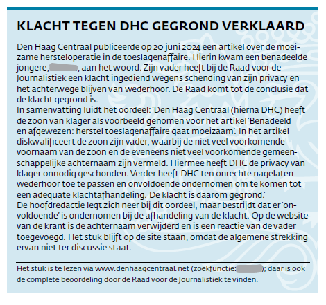 Den Haag Centraal (hierna DHC) heeft de zoon van klager als voorbeeld genomen voor het artikel “Benadeeld en afgewezen: herstel toeslagenaffaire gaat moeizaam”. In het artikel diskwalificeert de zoon zijn vader, waarbij de niet veel voorkomende voornaam van de zoon en de eveneens niet veel voorkomende gemeenschappelijke achternaam zijn vermeld. Hiermee heeft DHC de privacy van klager onnodig geschonden. Verder heeft DHC ten onrechte nagelaten wederhoor toe te passen en onvoldoende ondernomen om te komen tot een adequate klachtafhandeling. De klacht is daarom gegrond. De Raad doet de aanbeveling aan DHC om deze conclusie ruimhartig te publiceren.