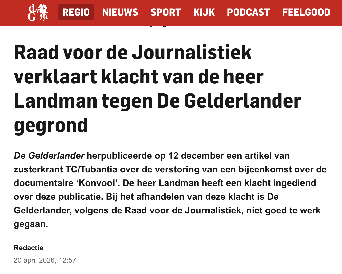 Dat het artikel op de website van De Gelderlander niet ook op 16 december 2025 – tegelijk met de publicaties op de andere websites – is aangepast, is kennelijk het gevolg van een fout en op zichzelf niet klachtwaardig.