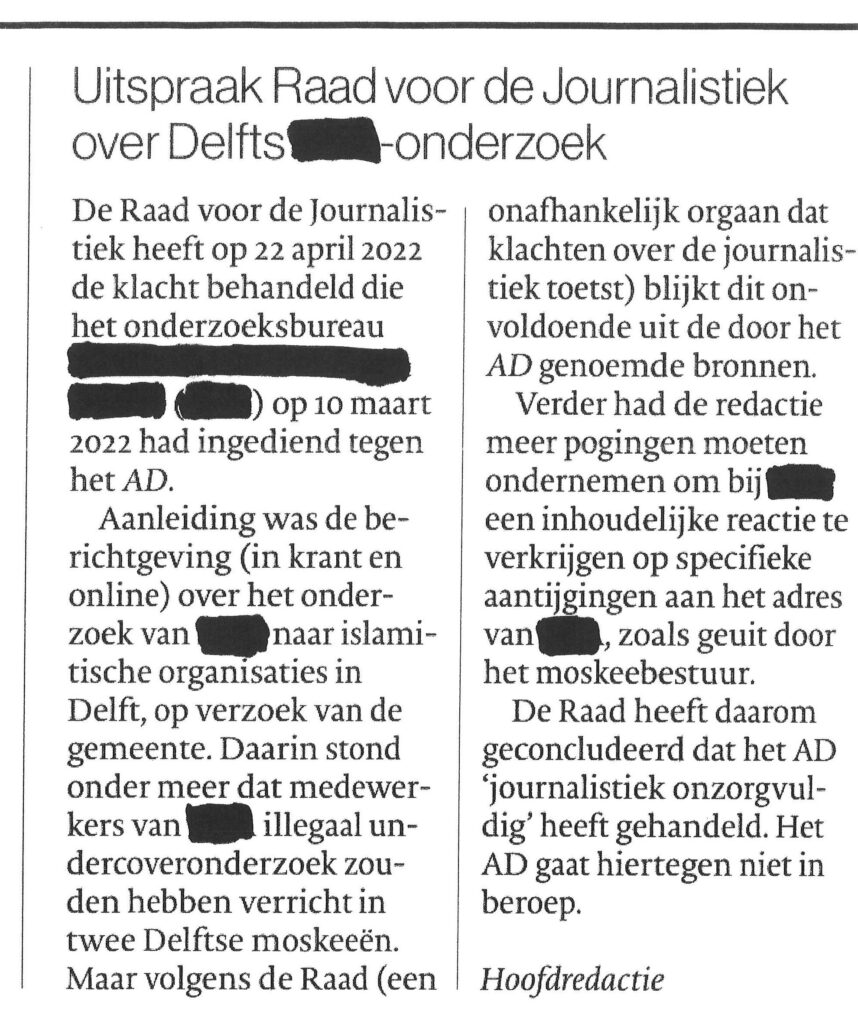 Dat klaagster in de twee genoemde moskeeën undercoveronderzoek heeft uitgevoerd blijkt echter onvoldoende uit de door het AD genoemde bronnen. Uit de diverse offertes valt niet op te maken dat klaagster in deze moskeeën undercoveronderzoeken heeft uitgevoerd. Dit volgt evenmin uit de brief van Grapperhaus, het rapport van advocatenkantoor Van der Feltz (dat gaat over Zoetermeer) en de e-mail van de gemeente Delft van 18 oktober 2021. Ook met de enkele verklaring van Maanaoui van 8 april 2022 zijn de beweringen niet alsnog deugdelijk toegelicht.